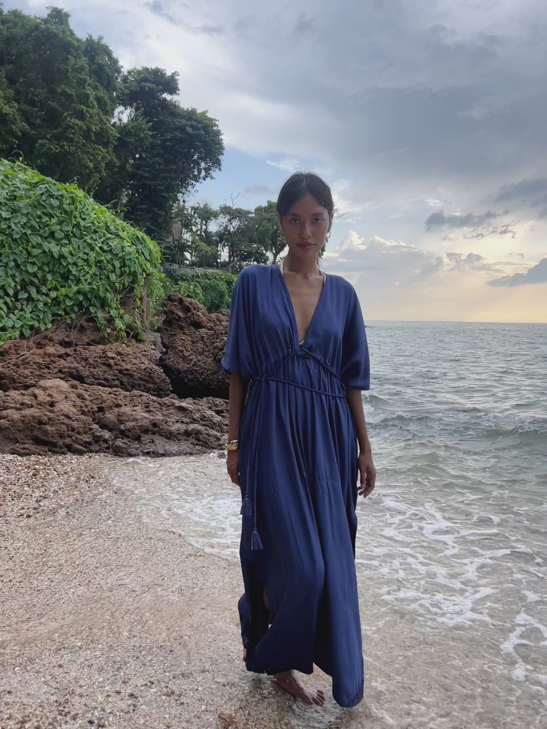The Kori Goddess Kaftan Maxi Dress is designed to exude an air of otherworldly elegance. It is crafted with a free-flowing silhouette, a plunging neckline and a self-tie string belt at the waist to accentuate the long skirt.