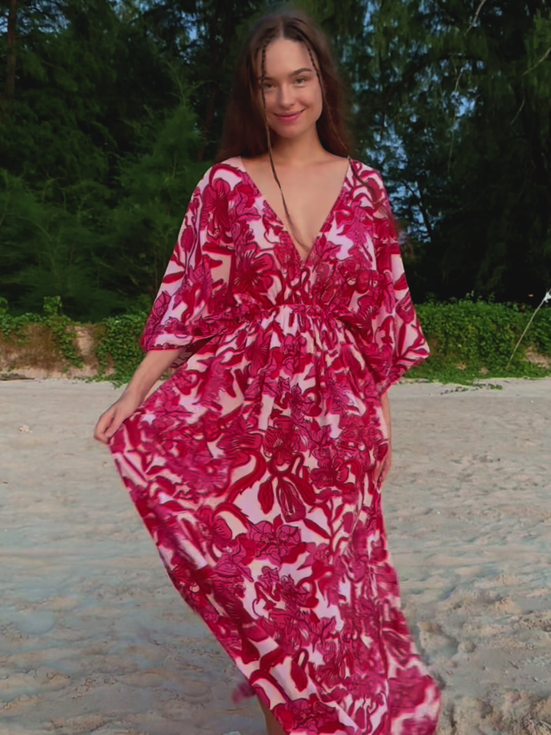 Step into the beauty of our Andaman Floral Kaftan Dress n Pink, featuring a stunning blend of vibrant colors and elegant design. This caftan dress embodies flowy, comfortable, and timeless elements, making it a versatile piece that can be worn as a dress, beach cover-up, or chic wrap kimono dress.