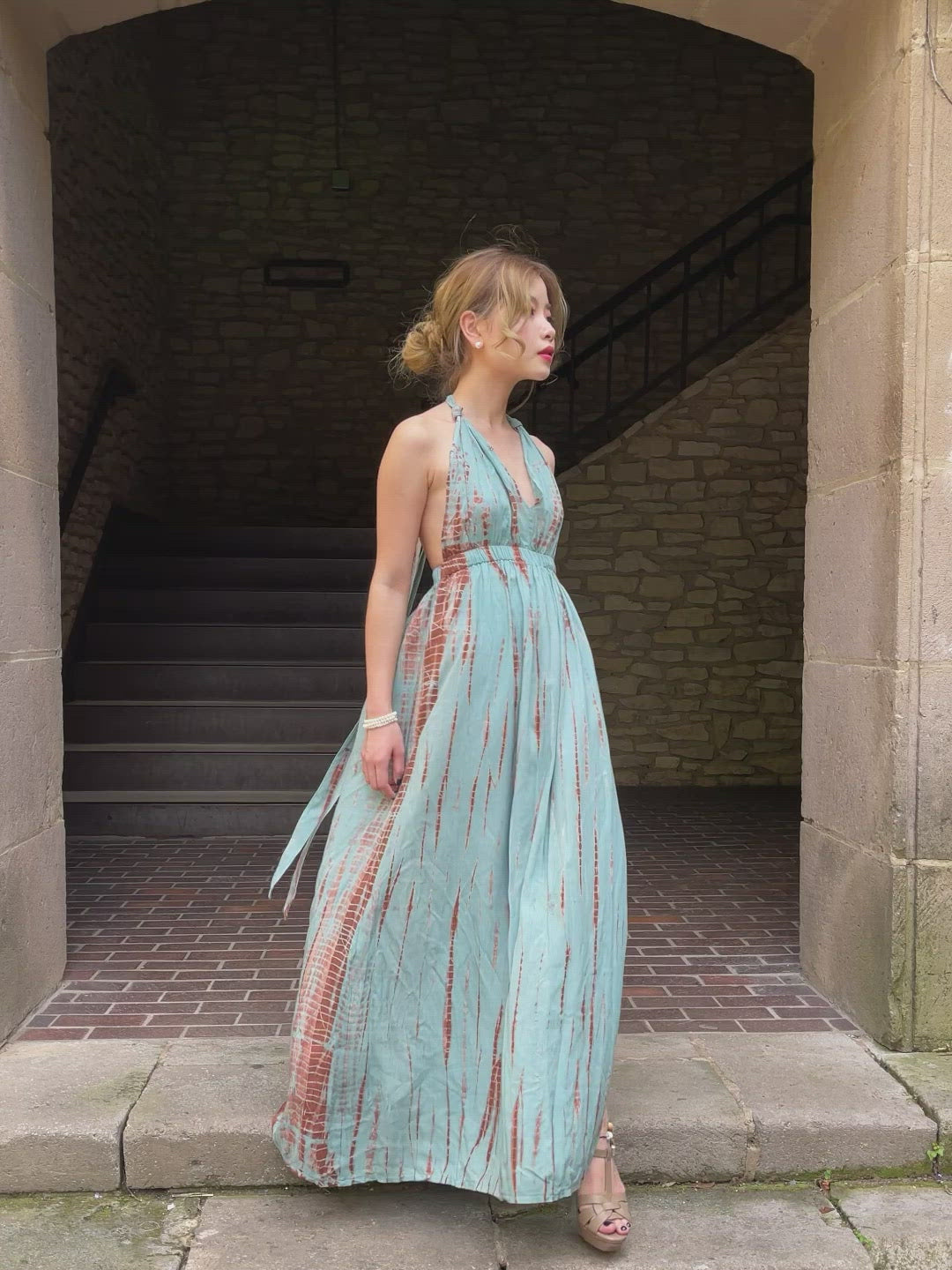 Athena’ goddess tie dye maxi dress - whether you’re walking the beaches of Santorini or basking in the summer sun of Miami, this tie-dye maxi dress is effortlessly glamorous. Its elastic waist hugs your curves, while the deep v-neck silhouette shows off your fresh summer glow.