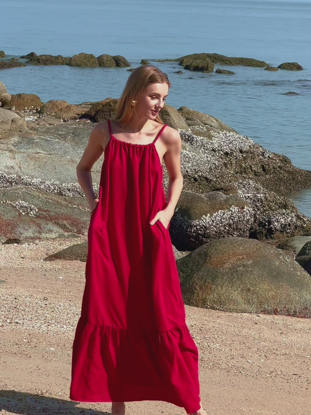 Discover our limited edition Olivia Maxi Dress. This red dress perfectly blends style, comfort, and versatility, effortlessly transitioning from day to night with its maxi length. It features an adjustable scoop back, rope detail straps, and ruffles for a chic vacation vibe.