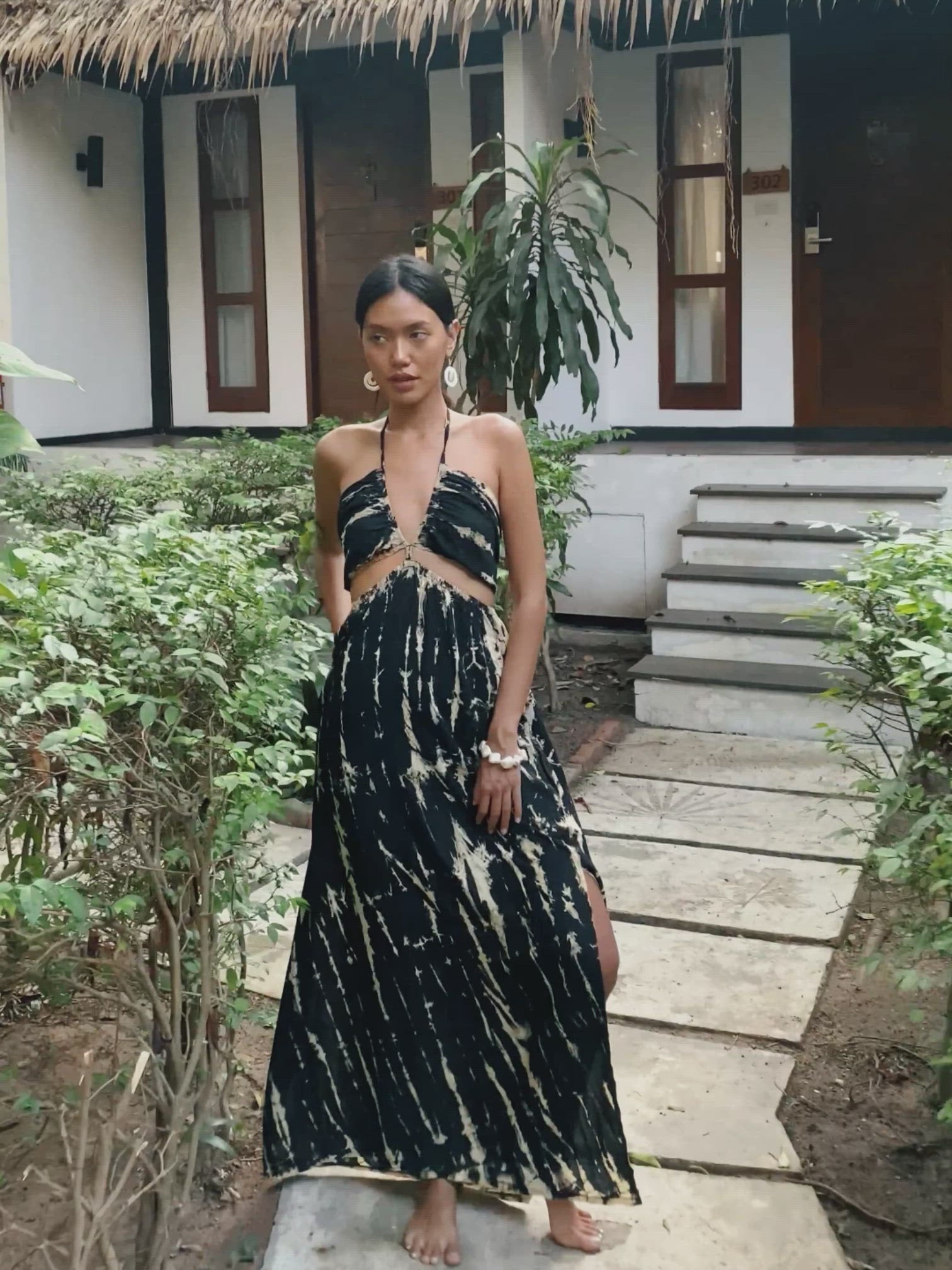 Selena Cut out Dress in Tie dye - Black/Beige Wave